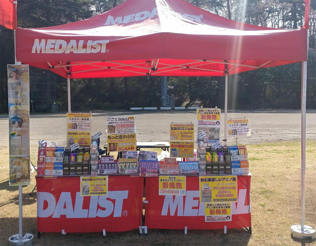 今年も「MEDALIST」ブース出店します。発売以来大好評の「飲むBCAA」=「アミノリキッド」胃に優しい「エナジージェル」、ミネラル補給「塩ジェル」、カフェイン補給「カフェイン200冴」、アミノ酸サプリ、クエン酸ドリンクなど、ランナーに必要な物を用意。